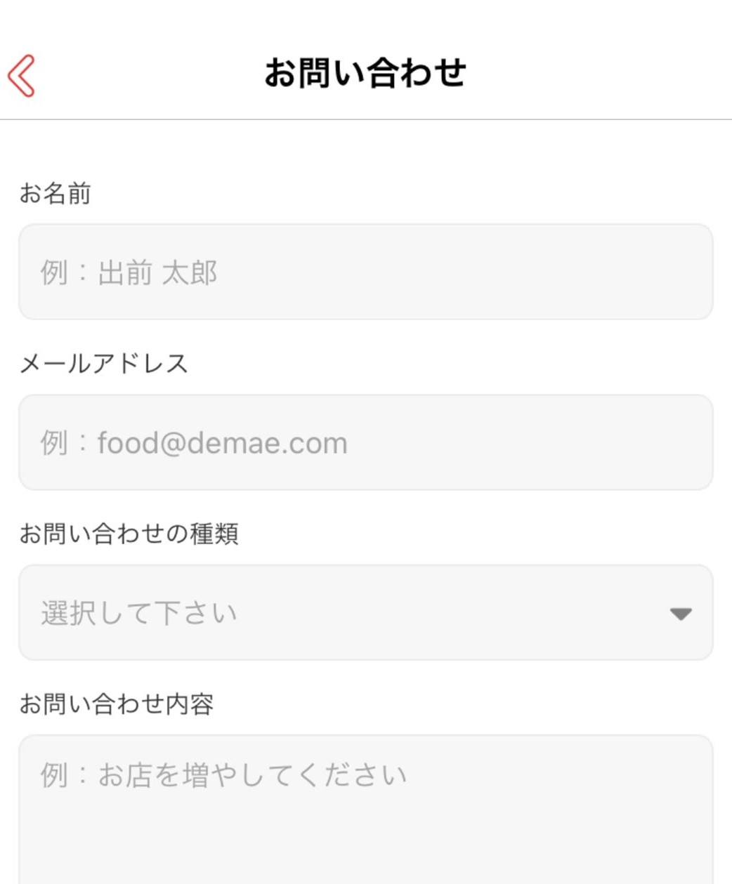 ウェブブラウザの出前館で問い合わせをする場合は左カラムの「お問い合わせ」をクリックし、アプリと同様の「名前」「メールアドレス」「問い合わせの種類」「問い合わせ内容」についての情報を入力します。