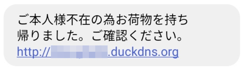 ・「ご本人様不在の為お荷物を持ち帰りましたご。確認ください。 http://(ランダムな文字列).duckdns.org」